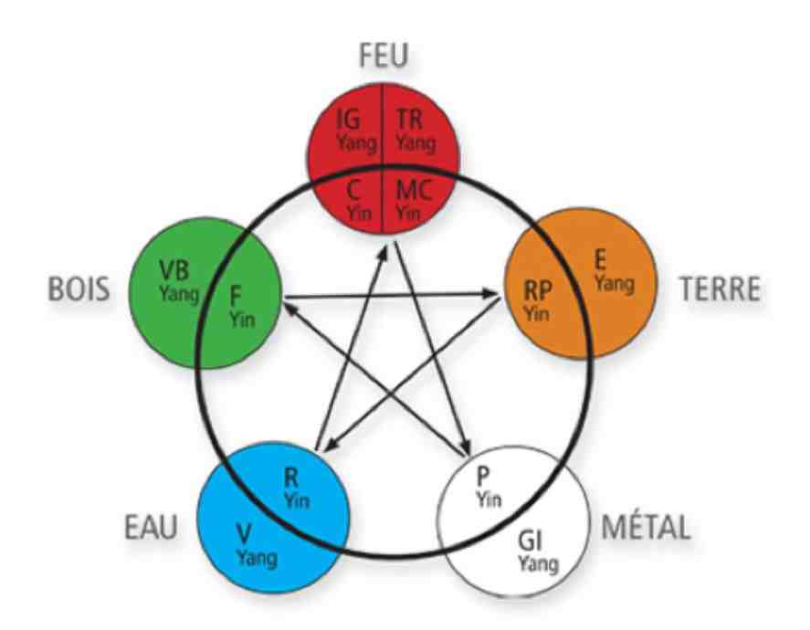Les 6 autres sont de polarité Yang ou positive : gros intestin, estomac, intestin grêle, vessie, triple réchauffeur (qui seconde le méridien de l’Intestin grêle et équilibre l’énergie donnée par le maître-cœur et la vésicule biliaire).